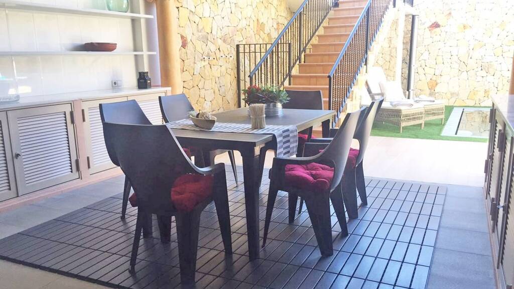 Das Erdgeschoss beherbergt einen Eingangsbereich, ein Gäste-WC, 3 Doppelschlafzimmer mit jeweils eigenem Badezimmer, ein Esszimmer, eine Küche sowie eine übergroße Garage. Im sehr privaten und nicht einsehbaren Patio befinden sich Sitz- und Liegeterrassen, ein Grillbereich sowie der Pool.
