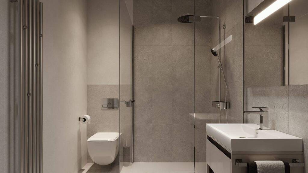Die Wohnung verfügt über ein großzügiges Wohn-/Esszimmer mit offener Küche und mit Zugang zur großzügigen Dachterrasse. Zusätzlich gibt es ein schönes Schlafzimmer, ein modernes Duschbad und einen Abstellraum.