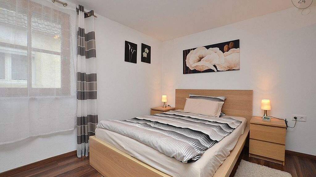 Die ca. 60m² große Wohnung, welche mit Parkettboden ausgelegt ist, befindet sich im 1.Obergeschoss eines Einfamilienhauses. Die Möblierung im Wohnzimmer besteht aus einer großen Couch mit Couchtisch, Sessel und einer Wohnwand mit TV eingerichtet. Die moderne Einbauküche ist mit einem Herd mit Backofen, Mikrowelle, Kaffeemaschine, Wasserkocher und sämtlichen Küchenutensilien ausgestattet. Außerdem befindet sich hier ein Esstisch für vier Personen. Das gemütliche Schlafzimmer ist mit einem 1,40m breiten Bett mit Nachttischen, geräumigen Kleiderschrank, Kommode und einem Schreibtisch eingerichtet. Von hier gelangt man in das hell geflieste Tageslichtbad, welches mit einer Eckbadewanne mit Duschvorrichtung und einem WC ausgestattet ist. Für den Mieter ist eine eigene Waschmaschine verfügbar. Zudem bietet ein Kellerabteil zusätzlichen Stauraum. In der angegebenen Miete ist eine Betriebskostenpauschale von 180€ enthalten. Wlan ist bereits im Mietpreis inkludiert. Bei einer Anmietung von 2. Person erhöht sich der Mietpreis um 80€/Monat. Bei Auszug wird eine Endreinigung je nach Aufwand mit der Kaution verrechnet. Vor dem Haus sind ausreichend Parkplätze vorhanden. Eine Bushaltestelle, sowie Geschäfte des täglichen Bedarfs befinden sich in fußläufiger Nähe. Mit dem Auto ist Schweinfurt in wenigen Minuten und Würzburg in ca. 30 Minuten erreichbar.
