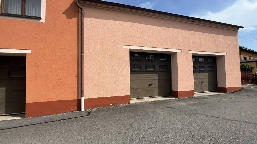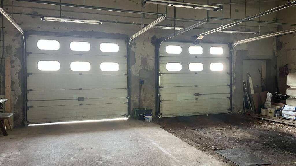 Holzrahmenfenster einfach verglast, Rolltore, Holzeingangstür Feuerfeste Brandschutztür zwischen der ersten und den hinteren Garagen, einfache Sanitärausstattung mit Dusche, WC und Waschbecken, einfache Elektroinstallation