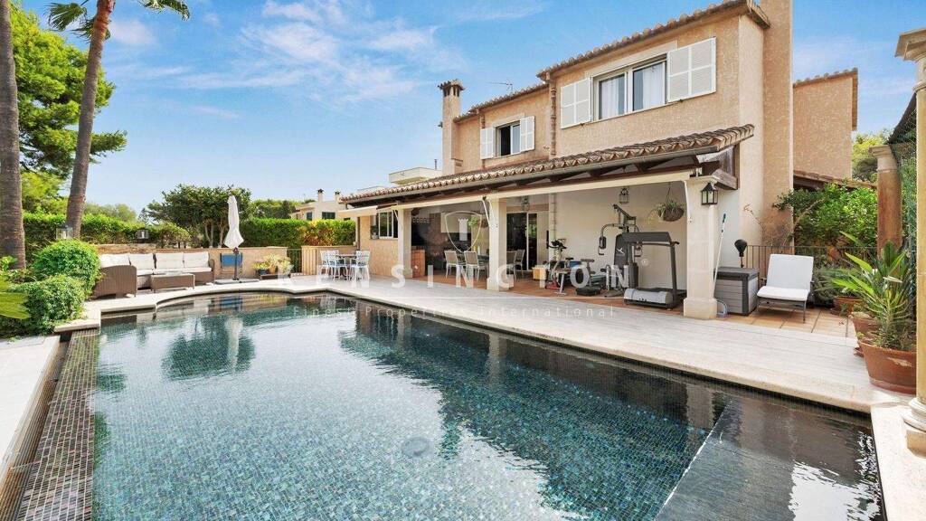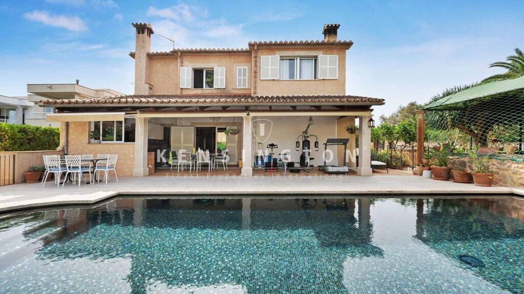 Diese Villa mit Pool liegt in Bellavista, 19 km südöstlich von Palma de Mallorca. Einen kurzen Spaziergang entfernt ist eine lauschige Badebucht. Die Villa wurde 2001 von einem Bauunternehmer für sich selbst erbaut. Daher sind Bauqualität und Ausstattung auf höchstem Niveau. Das Haus ist sehr gepflegt, und es hat einen praktischen Grundriss mit durchgehend großen Räumen. Vor dem Wohnbereich befindet sich eine geräumige überdachte Terrasse (32m²) mit Sommerküche sowie der beheizte Pool (9x4 m) mit motorisierter Abdeckung. Zudem gibt es eine sonnige Terrasse (20m²) im OG und eine Dachterrasse (32m²) mit wunderbarem Meerblick.