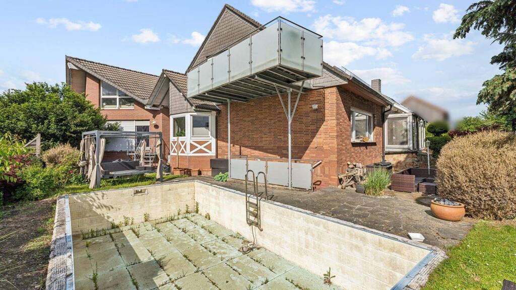 Der gepflegte Außenbereich beeindruckt mit einem Swimmingpool, einer großzügigen Terrasse sowie einem Balkon, die zum Entspannen und Verweilen einladen. Das Grundstück bietet zudem eine angenehme Privatsphäre und viel Grünfläche - perfekt für Familien mit Kindern oder Gartenliebhaber.