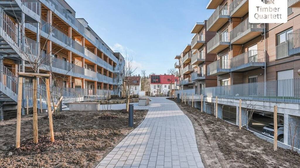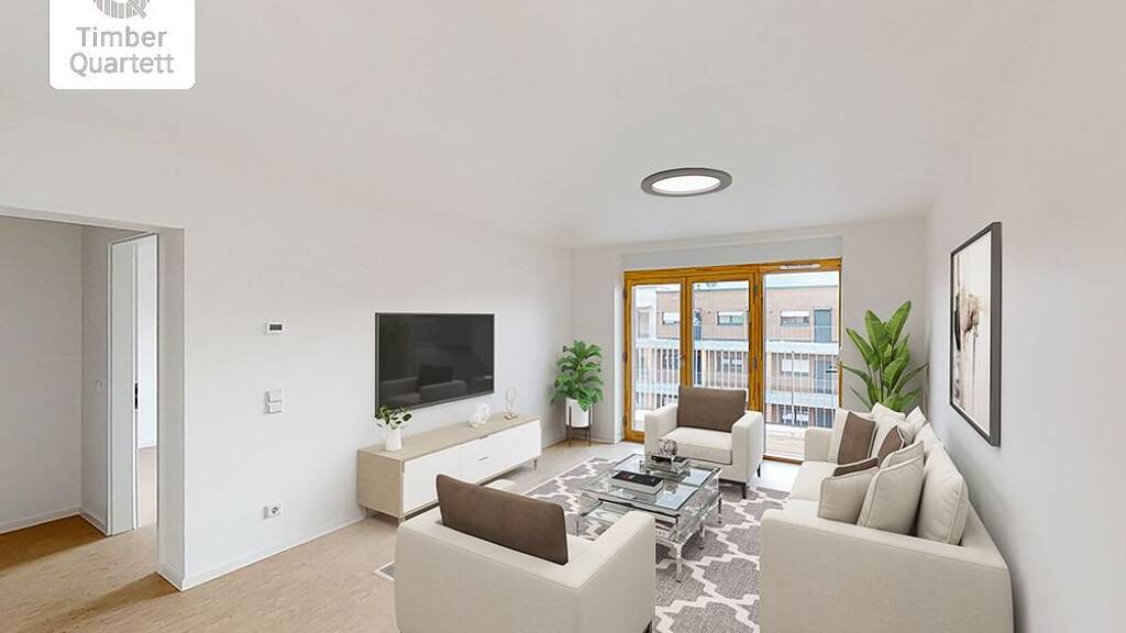 Bei den Bildern handelt es sich um unverbindliche Visualisierungen (Visualisierung TOWN) und Bilder der Musterwohnung. Gerne können Sie sich im Zuge einer Besichtigung der Musterwohnung selbst vom TimberQuartett überzeugen.