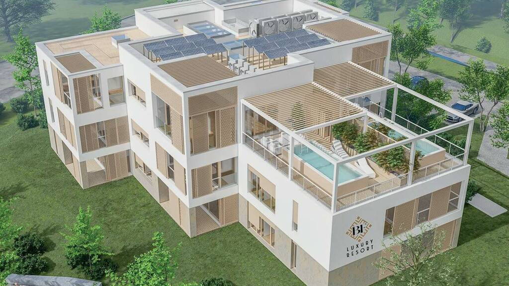 Eine Luxuswohnanlage bestehend aus 3 Gebäuden mit insgesamt 27 Wohnungen Jede Wohnung verfügt über 3 Schlafzimmer, 2 Bäder, ein Gäste-WC, eine offene Küche mit Wohnbereich und eine Terrasse Die drei Gebäude sind durch eine geschlossene Tiefgarage mit insgesamt 62 Stellplätzen und 43 Lagerräumen verbunden Die Verbindung zwischen Tiefgarage und den Etagen der Gebäude wird durch 8 Personenaufzüge erleichtert Erdgeschosswohnungen haben einen eigenen Grünbereich, der an die Terrasse anschließt Penthouse-Wohnungen bieten einen eigenen Wintergarten und die Möglichkeit zur Installation eines Pools Die Energieversorgung der beheizten und gekühlten Gemeinschaftsbereiche sowie des Treppenhauses wird durch eine Solaranlage auf dem Dach sichergestellt, wodurch diese Bereiche nahezu energieautark sind Jede Wohnung ist mit einer Fußbodenheizung über eine Wärmepumpe sowie einer Klimaanlage mit Heiz- und Kühlmodus ausgestattet, deren Außeneinheiten auf dem Dach installiert sind Aluminiumfenster mit motorisierten Rollläden und Jalousien in jedem Raum werden eingebaut