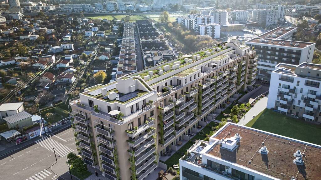 Großzügige Balkone und Terrassen mit integrierten Pflanzmöglichkeiten erweitern den Wohnraum ins Freie und laden zur Gestaltung persönlicher Grünoasen ein. Bodentiefe Fenster bringen viel Tageslicht in die Wohnungen und schaffen fließende Übergänge zwischen Innen- und Außenbereich. Zusätzlich stehen auf den Dachflächen individuell erwerbbare Garten- und Hochbeete zur Verfügung - ideal für alle, die Freude an urbanem Gärtnern haben. Gemeinschaftliche Freiflächen mit Sitzmöglichkeiten und Pergola bieten Platz für Erholung und Begegnung mit beeindruckendem Ausblick. Ein begrünter Innenhof mit vielfältigen Spiel- und Aufenthaltsmöglichkeiten ergänzt das Angebot und sorgt für hohe Aufenthaltsqualität direkt im Haus. Nachhaltig & wirtschaftlich attraktiv