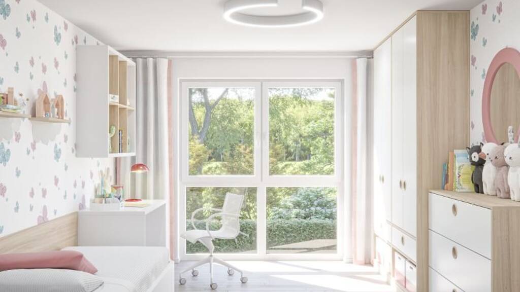 Dieses Einfamilienhaus mit einem 2,25 m hohen Kniestock bietet viel Platz und fast keine Dachschrägen in der oberen Etage. Die Variante mit "drittem Giebel in Flachdachoptik" erweitert auf sinnvolle Weise den Essbereich im Erdgeschoss und vergrößert gleichermaßen das Gästezimmer im Dachgeschoss um weitere vier Quadratmeter. Somit können im Dachgeschoss sogar drei, nahezu gleich große, Kinderzimmer untergebracht werden. Ebenfalls in der oberen Etage befindet sich das Elternschlafzimmer und das moderne Familienbad mit modernem Zuschnitt.