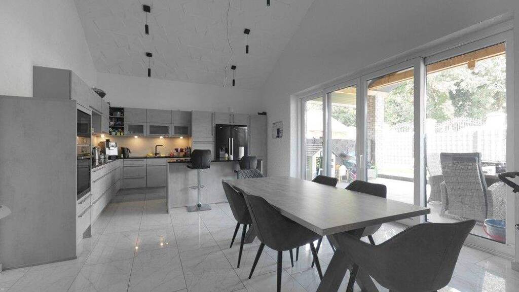 Die ca. 171 m² Wohnfläche verteilen sich auf einen ca. 60 m² großen Koch-, Ess- und Wohnbereich mit hochwertiger Einbauküche und Zugang zur überdachten Terrasse. Ein Elternschlafzimmer schließt sich dem großen Wohnbereich an. Ein abgetrennter Ankleidebereich sorgt für eine schöne Ordnung.