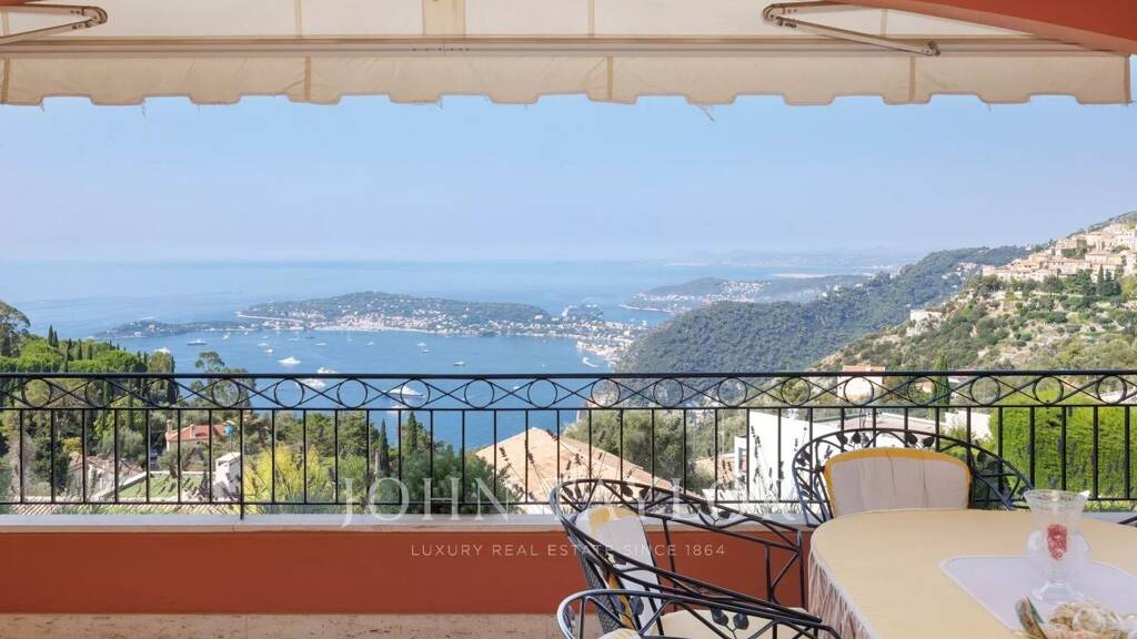 Sie werden sich nicht satt sehen an diesem Blick auf das malerische Dorf Èze, mit Saint-Jean-Cap-Ferrat, dem Mittelmeer, Nizza, Cap d'Antibes und dem Esterel-Massiv im Hintergrund.