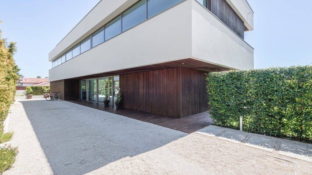 Dreigeschossig, überzeugt es durch großzügige Flächen, große verglaste Bereiche, die natürliche Beleuchtung garantieren, und einen Außenbereich mit Garten, Pool und Terrassen.