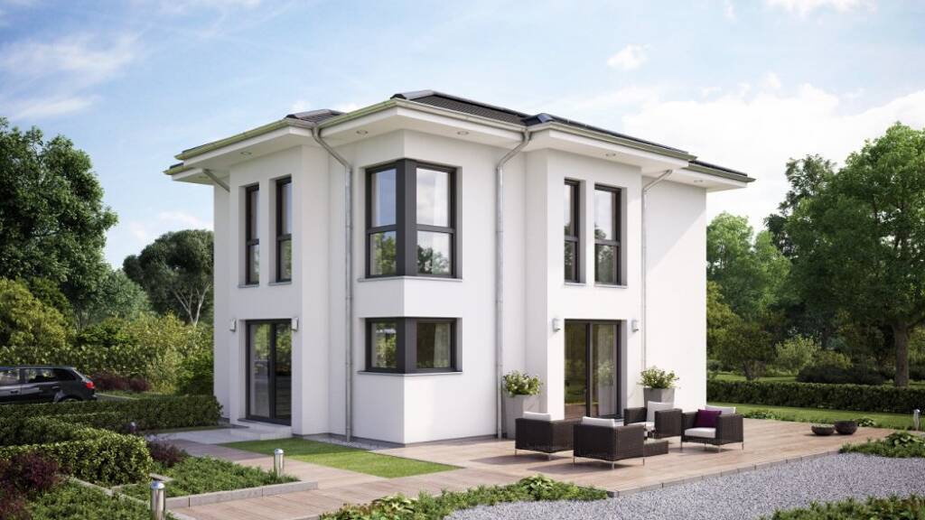 Das Haus ist auf einem realen Baugrundstück geplant oder auf einem Grundstück in einer Planungsphase. Die Bilder zeigen ggf. Extras, die im Rahmen des Bebauungsplans noch geprüft werden müssen.