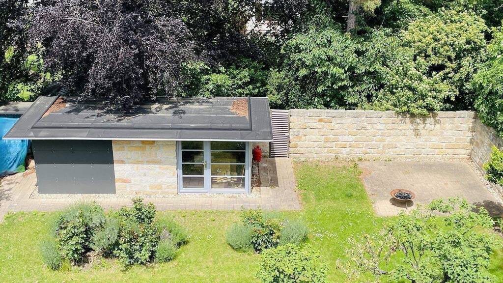 Das reizvolle und weitläufige Grundstück hinter dem Haus ist uneinsehbar. Es hat eine angenehme Größe von ca. 770 m². Ein alter Baumbestand und zahlreiche immergrünen Pflanzungen sowie eine große Rasenfläche sind pflegeleicht angelegt. Ein großzügiges Gartenhaus mit kleiner Gartenküche und einer Terrasse runden die Erholung im Garten ab. Ein Zugang in das Haus ist bequem über das Souterrain möglich. Ein Carport für zwei PKW ist ebenfalls vorhanden.