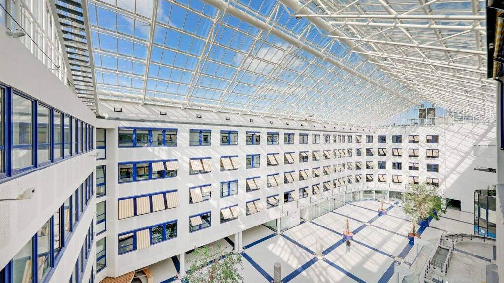 Das Büro ist mit Innenverschattungen (Jalousien) und teilweise mit Außenverschattungen (Markisen) ausgestattet (Bereich zum Glas-Atrium "Plaza").