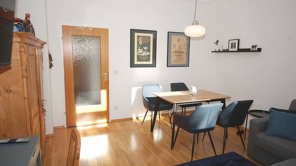 Zwei-Zimmer Wohnung mit großzügigem Wohnzimmer. Das Wohnzimmer verfügt über eine Couch, die im Bedarfsfall als 3. Schlafplatz genutzt werden kann. Die weitere Möblierung besteht aus einem Esstisch mit vier Stühen sowie einem Sideboard mit Fernseher. Im separten Küchenraum ist eine Einbauküche mit allen gebräuchlichen Haushaltsgeräten, Spülmaschine und Küchenutensilien augestattet. Das Schlafzimmer verfügt über ein Doppelbett mit Federkernmatratzen und Lattenrost sowie einen geräumigen Kleiderschrank.