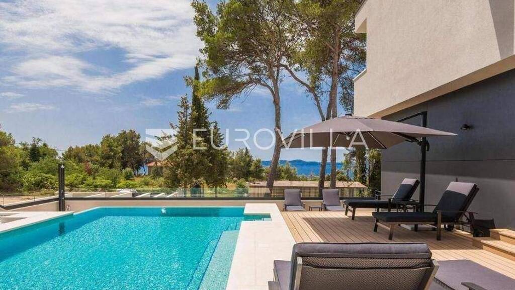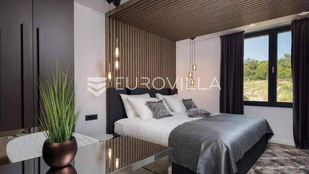 Zadar, Diklo, prekrasna vila s bazenom i pogledom na more prostire se na povrsini zemljista od 1209 m2.Ova luksuzna vila proteze se na tri etaze, a izgradena je prema najsuvremenijim standardima, elegantnog je i modernog dizajna.U suterenu se nalazi garaza za dva automobila, praonica, teretana, sauna te strojarnica.U prizemlju vile nalazi se prostrani dnevni boravak, kuhinja i blagovaonica sa izlazom na terasu, radna soba te gostinjski wc.Unutarnjim stepenistem dolazi se na trecu etazu gdje se nalazi pet spavacih soba sa pripadajucim kupaonicama i garderobama.Spavace sobe imaju izlaz na terasu s koje se pruza pogled na more, a ovdje se nalazi i jacuzzi.U dvoristu vile nalazi se bazen, suncaliste, vanjski tus te ljetna kuhinja koja je idealna za druzenje i blagovanje.Ova prostrana vila savrsen je spoj luksuza i udobnosti.Vise informacija na upit.... Vise na eurovilla.hr, ID: 108702