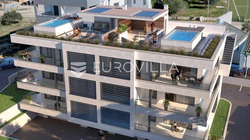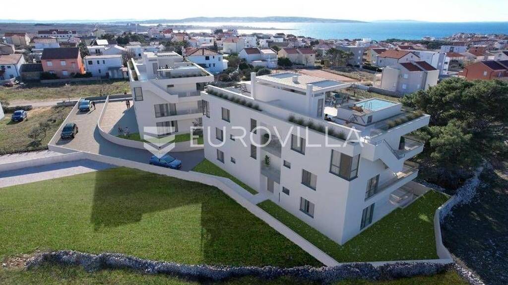 Predstavljamo Vam zgradu u novogradnji u poznatom turistickom odredistu na otoku Pagu, Povljani. Zgrada se sastoji od ukupno 8 stambenih jedinica rasporedenih na ukupno 4 etaze. Zgrada se nalazi 400 m od centra mjesta i svih sadrzaja koji su potrebni za kvalitetan zivot ili odmor dok je od mora udaljena 800 m.PENTHOUSE S8 - 2. KAT - BAZEN - KROVNA TERASA - 140m2Penthouse S8 se nalazi na drugom katu zgrade te je ukupne neto korisne povrsine 140m2. Na prvoj etazi se nalazi hodnik (2,92m2), otvoreni prostor kuhinje, blagovaonice i dnevnog boravka (40,82m2), tri spavace sobe (13,27m2, 15,22m2 i 8,89m2), dvije potpuno opremljene kupaonice (3,39m2 i 3,59m2), WC (1,45m2) i nenatkriveni balkon (17,78m2). Vanjsko stubiste (5,00m2) nas vodi na krovnu terasu koja se sastoji od ljetne kuhinje s kominom, natkrivenog i nenatkrivenog dijela terase, WC-a, spremista te vanjskog bazena (10,38m2). S terase se pruza neopisiv pogled na more.Penthousu uz to pripada i spremiste u podrumu zgrade, jedno garazno parkirno mjesto te jedno vanjsko.Predvideno useljenje : 04/2026PDV JE UKLJUCEN U CIJENU STANA TE KUPAC NE PLACA POREZ NA PROMET NEKRETNINAMA.Od opreme i materijala valja izdvojit :Vrhunsku PVC stolariju s elektricnim roletama i ugradenim komarnicimaMulti split sustav klimatizacije u svim spavacim sobama te dnevnom boravkuToplinska izolacija debljine 10 cmPortafonLiftProtuprovalna i protupozarna vrataI jos mnogo togaZa vise informacija i dogovor oko razgledavanja obratite nam se s povjerenjem... Vise na eurovilla.hr, ID: 242328