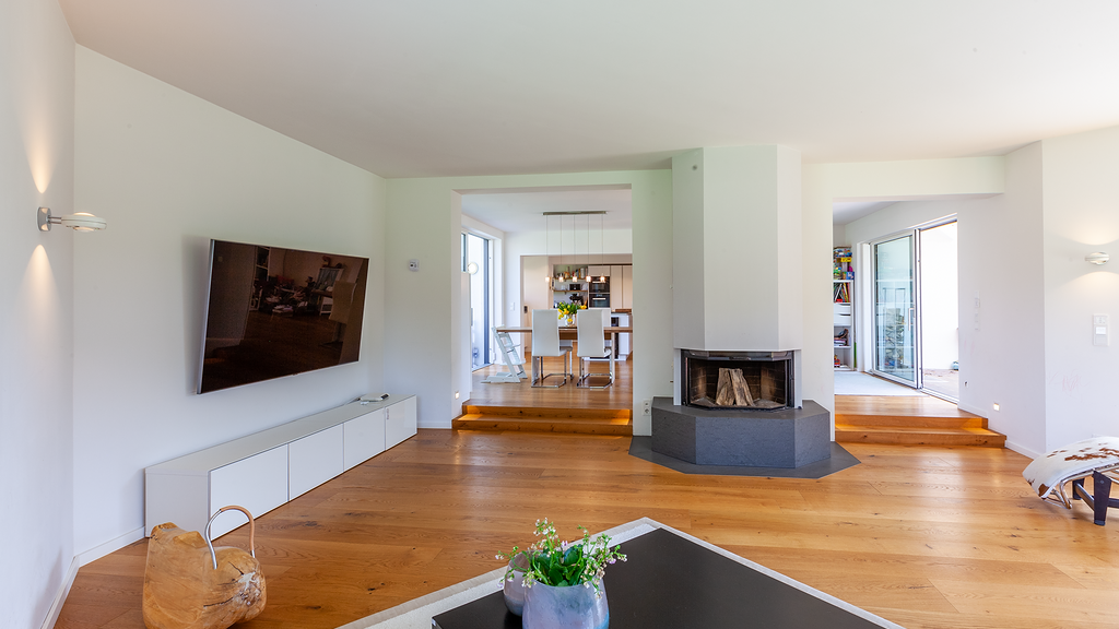Das behagliche Landhaus ist angelegt über Erdgeschoss, Obergeschoss und ein voll ausgebautes Untergeschoss. Im Erdgeschoss wurden einige Wände entfernt und neue Fenster angebracht. Die Küche ist offen gestaltet und geht in den Wohnraum mit offenem Kamin und neuem Panoramafenster über. Hier befinden sich neben dem Eingang eine Gästetoilette und ein Büroraum mit hübscher Westterrasse. Das untere Geschoß ist über einen separaten Zugang begehbar und kann als Büro, Einliegerwohnung oder je nach Bedarf genutzt werden. Hier könnte man auch durch Einziehen einer Wand eine komplette Trennung ohne viel Aufwand ermöglichen. Das Haus ist voll unterkellert, hier befinden sich neben der Sauna und zwei Abstellräumen ein weiterer Raum, der derzeit als Fitnessraum genutzt wird. Im oberen Geschoss befinden sich zwei größere und ein kleineres Schlafzimmer ( oder 2. Ankleidebereich) sowie zwei großzügige Bäder. Entlang des Flurs ist Platz für Kleidung, vom oberen Stock ist bei klarer Sicht teilweise sogar ein Bergblick zu erhaschen. Der großzügige Garten ist sehr liebevoll und idyllisch angelegt. Blumenbeete, alte Bäume, einige Außen-Sitzplätze bieten ausreichend Raum zur Entfaltung und zu zahlreichen Rückzugsmöglichkeiten mit viel Sonne zu jeder Tageszeit. Ein Traum für Gartenliebhaber und Kinder, die hier endlos toben können! Es gibt eine Doppelgarage und weitere Parkmöglichkeiten neben dem Haus.