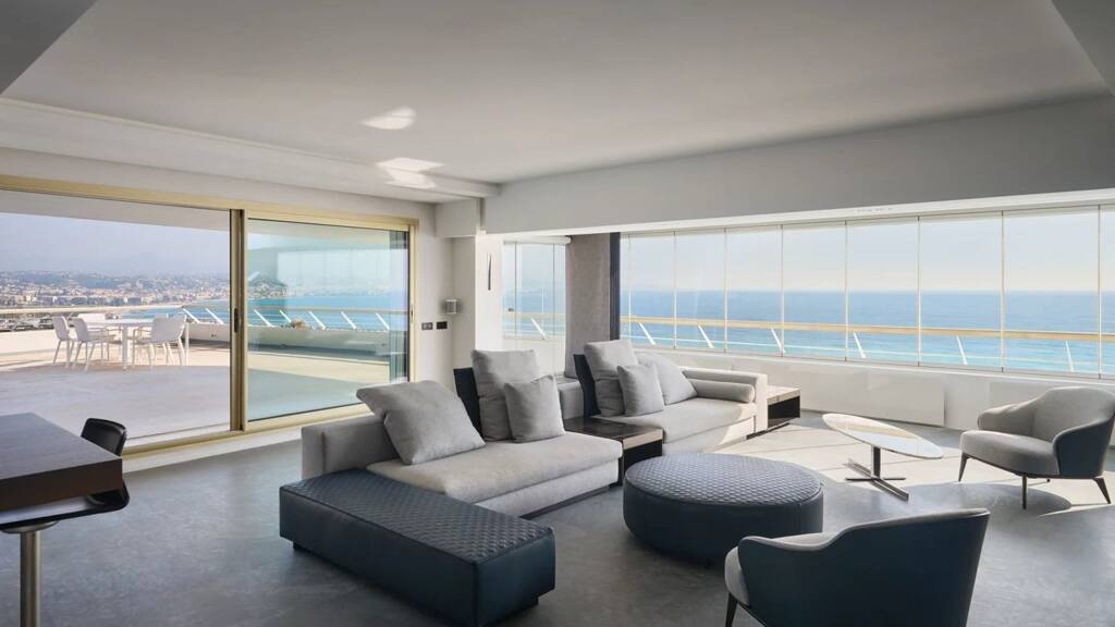 Its private elevator access and prime location provide breathtaking panoramic views of the sea, from Cap Ferrat to Cap d'Antibes, as well as the Marina and the Alps. The direct access to the beach adds an exclusive touch to this rare property.