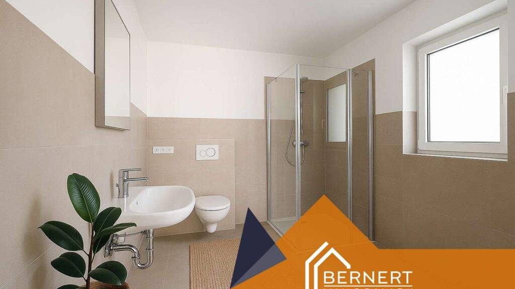 Das Badezimmer ist ein echtes Highlight: Es präsentiert sich in modernem Design mit ebenerdiger Dusche, eleganten Fliesen und hochwertigen Sanitärelementen - perfekt für zeitgemäßes, komfortables Wohnen.