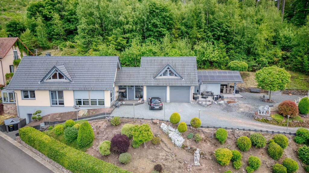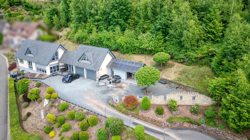 Baujahr 1954 in 2005 bis 2009 komplett saniert ( Neubau ) Kellergeschoss Bunker aus dem 2 Weltkrieg ( 100 cm Wandstärken, Decke UK Decke bis OK Boden 150 cm ) voll Nutzbar. Hier ist die Inneneinheit der Luftwärmepumpe mit dem Pufferspeicher verbaut. Zudem die Kontrollierte Wohnraumbelüftung der Firma Nilan installiert. Rest ist mit Schwerlastregalen versehen und Aufbewahrung der Gartengeräte. Kellereingangstür ( Haustürrohling mit Bolzenschloss, Sicherheitszylinder, Ziehschutz und Stoßgriff. ( gleich schließend mit den allen Außentüren ). Schließsystem mit Karte. Farbe Basaltgrau Mülltonnengarage mit Rolltor der Firma Roma ( Alupanzer 14/77 Anthrazitgrau) Standbriefkasten der Firma Renz in Anthrazitgrau Wege und Kellereingang sind mit Basalt Palisaden eingefasst Im Erdreich sind 38m /350mm im Durchmesser ca. 170cm tief Rohre für den Ansaugturm der Nilan Anlage verlegt. Dach ( Dachkonstruktion komplett aus BSH Leimholz gefertigt in Sichtqualitat ) ( Ohne Metallwinkel, alle Verbindungen sind aus Schwalbenschwanz und Zapfenverbindungen hergestellt ). Als Dachisolierung wurde eine Arktisfolie verbaut ca. 15 Lagen Prinzip Aludecke im Verbandskasten darunter die Verschalung aus 24 mm Fasenbretter gewachst, die von innen komplett sichtbar sind. Ziegeleindeckung mit Creaton engobiert schwarz Darüber ist eine PA-Anlage von 12,5 KW verbaut, mit 7,5 KW Speicher und 3 Wechselrichter SCM. die in der Garage installiert wurden. Benötigen aufs Jahr hingesehen nur ca. 33 % aus dem Netz. Außen Haben wir eine 50 qm große Holzterrasse aus Bankirei, eine 19 m lange Mauer mit Fensteröffnungen und alten Eichenbalken als Sichtschutz. Komplette Fläche ist mit Basaltsplitt versehen. ( Einfahrt, Platz vor Podest der Haustüranlage und Doppelgarage ca 500 qm). Hinter dem Haus sind über die ganze Hauslänge von 37,8 m 6 x 8 x 20 er Verbundsteine verlegt. Dort steht auch die Außeneinheit der Luftwärmepumpe von Weishaupt BICBlock und von der Klimaanlage im Dachgeschoss. Elektroinstallation Hauptkasten fünfreihig mit 6 Unterverteilungen mit 20 quatrat Zuleitung pro Unterverteilung. Alle Steckdosen im Haus sind mit 2,5 quatrat Zuleitungen einzeln angeschlossen. ( das heißt alle Kabel gehen einzeln ohne Verteilerdosen in den Sicherungskasten ). genau wie jeder Lichtschalter, jede Lampe und die Zuleitungen für die Rollladenmotoren. Außen sind über das ganze Gelände Erdkabel verlegt die zusätzlich mit Leerrohr geschützt sind. Busch-Jäger Anlagen (Haustür mit Kamera und Sprechanlage weltweit ). ( für die außen Beleuchtung, Steckdosen und Motoren ). In der Garage befindet sich eine Lade-station für Elektro- Autos die 90% über die PA-Anlage versorgt wird Im ganzen Haus sind nur LED Lampen oder Leuchtmittel verbaut. Zentral Staubsaugersystem, Hauptgerät in der Garage mit im ganzen Haus verteilte Dosen für den Schlauch mit den Saugaufsätzen.
