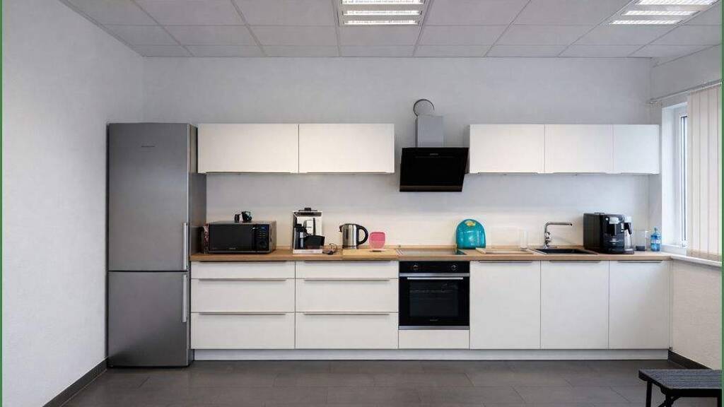 Im Obergeschoss befinden sich: - das Büro der Firma, die auch die Halle nutzt - weitere WCs (gemeinschaftliche Nutzung und inbegriffen) - die große Küche mit vollausgestatteter Einbauküche ((gemeinschaftliche Nutzung und inbegriffen) - der Serverraum (gemeinschaftliche Nutzung und inbegriffen)