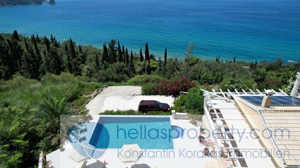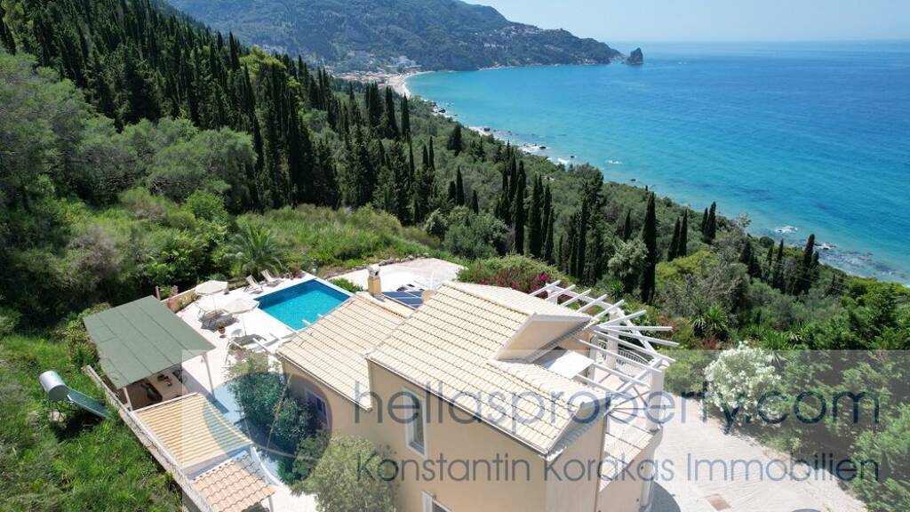 Diese atemberaubende freistehende Villa mit 3 Schlafzimmern, wunderschönen angelegten Gärten und privatem Pool befindet sich in einer einzigartigen Lage in der Gegend von Agios Gordios im Westen von Korfu und nur 5 Gehminuten von einem abgelegenen Teil des Hauptsandstrandes des Resorts entfernt genießt sowohl einen atemberaubenden Blick auf das Meer als auch auf die Landschaft.