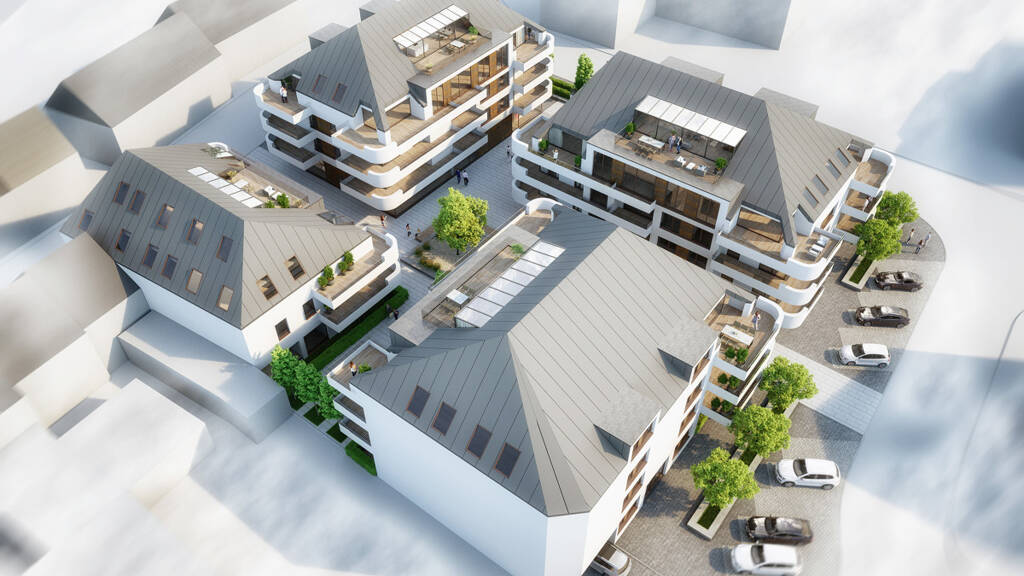 Im Herzen von Schweich, direkt gegenüber dem Rathaus, entstehen neue Wohn- und Gewerbeflächen im "Karree Neue Mitte". Das Gebäudeensemble mit vier Baukörpern überzeugt durch gelungene Architektur, eine hochwertige Ausstattung der einzelnen Wohneinheiten und die Berücksichtigung ökologischer Aspekte bei der Gestaltung sowohl der Gebäude als auch der Frei- und Grünflächen.