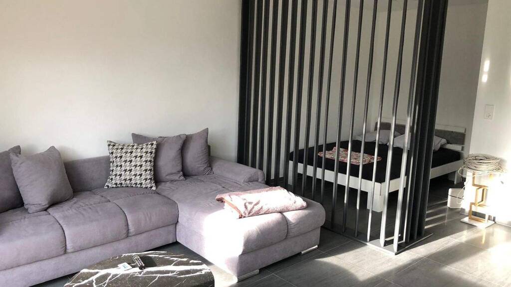 In der Wohnung selbst hast du ein separates Schlafzimmer mit einem großen Bett, welches durch eine Außergewöhnliche Trennwand separiert vom Wohnraum ist (Loft Ambiente). In dem Wohn- und Essbereich befindet sich ein Fernseher (75 zoll), ein Tisch für 4 Personen, eine offene Küchenzeile und ein Schrank. Zusätzlich befindet sich ein Schlafsofa, dass für weitere 2 Personen umfunktioniert werden kann. Die Küche mit sämtlicher Ausstattung (Kühlschrank, Spühlmaschine, Herd, Backofen, Geschirr, Töpfe, Pfannen etc.) steht bereit, darüber hinaus gibt es eine Nespresso Kaffeemaschine mit verschiedenen Kaffee- und Espressosorten und eine Auswahl an Tee. Im Badezimmer ist eine Duschkabine, Waschmaschine, Waschbecken und selbstverständlich eine Toilette. Solltest du bei deiner Reise etwas vergessen haben, steht gerne für dich im Badezimmer Shampoo, Duschgel, Deo und ein Föhn zum Benutzen bereit.