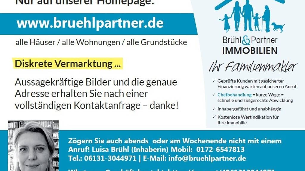 Büro: 06131 30 44 971 Mobil: 0172 654 78 13 WhatsApp-Geschäftskontakt: https://wa.me/4961313044971 E-Mail: info@bruehlpartner.de Internet: www.bruehlpartner.de ----------------------------------------------------- Hinweis: Grundrisse sind nicht maßstabsgetreu und das enthaltene Mobiliar dient nur zur Illustration. Es gelten ausschließlich notariell beurkundete Verträge. Sämtliche Bilder, Texte und Grafiken sind geschützt und dürfen nicht verwendet, vervielfältigt oder weiter gegeben werden ohne vorherige schriftliche Genehmigung.