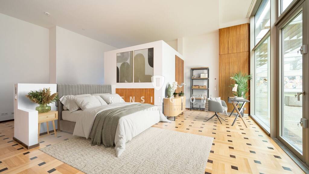 Vom Wohnbereich abgehend ist das Schlafzimmer sowie das Master-Bathroom begehbar. Neben dem historisch-inspirierten Einbauschrank bietet eine Nische für einen weitere zukünftigen Kleiderschrank ausreichend Platz zur Aufbewahrung der Kleidung. Das Master-Bathroom besticht als Vollbad mit exklusiven Armaturen und Sanitärobjekten sowie modernen Fliesen - besonders auffällig ist hier sowie im Gäste-WC die Leuchtspanndecke, die die Nähe zur Natur erneut betont und so das Konzept der Wohnung fortführt . Die bodentiefe Fensterfront des Schlafzimmers ermöglicht mit ihrer Ost-Ausrichtung das Aufstehen unter der begehrten Morgendämmerung. Auch vom Schlafzimmer aus ist die weitläufige Eckterrasse begehbar.