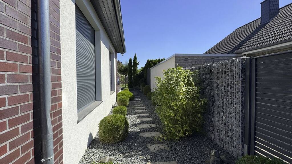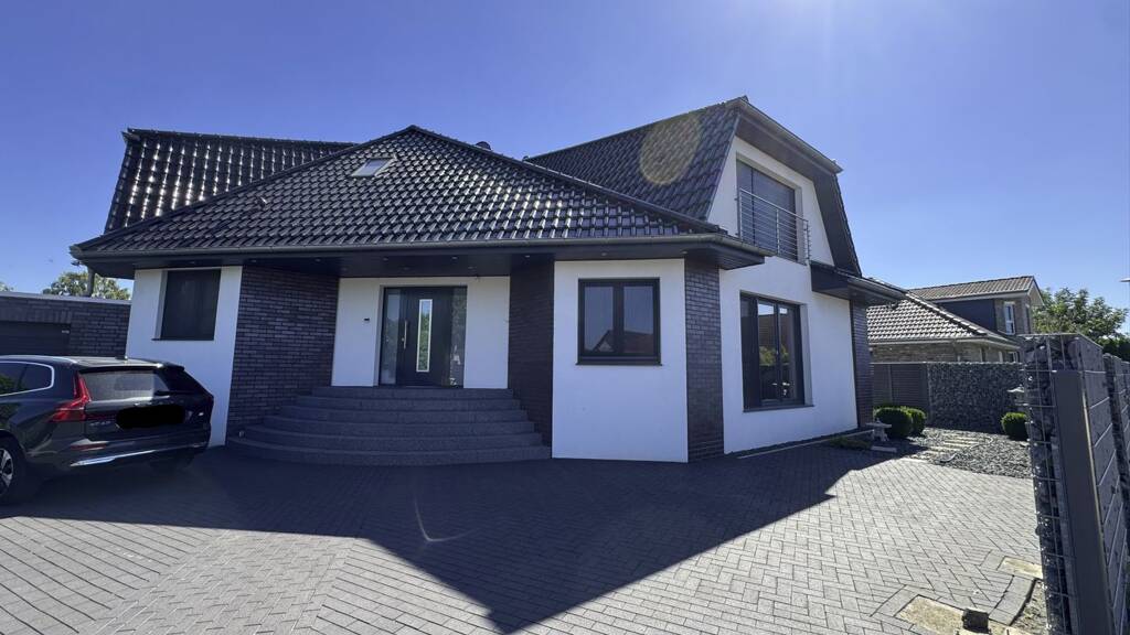 Diese exklusiv gestaltete Villa aus dem Jahr 2024 bietet auf rd. 360 m² Wohnfläche repräsentatives und komfortables Wohnen. Die Zufahrt auf das Grundstück ist gepflastert, so dass vor der Doppelgarage noch mehrere Fahrzeuge geparkt werden können. Bereits der einladende Hauseingang mit dem durch Glas strukturierten Türelement lässt die Großzügigkeit der Wohnräume erahnen. Rechts des Entrees liegt der lichtdurchflutete Wohnbereich, der durch detailliert gestaltete Deckenabhängungen und Öffnungen bis hinauf in das Obergeschoß ein außergewöhnliches Wohnen ermöglicht. Das Haus wird über eine Fußbodenheizung geheizt, die Warmwassererzeugung findet mit Solarunterstützung statt, zusätzlich ist der Kamin Wasserführend. Die Küche mit Zugang zur Terrasse bietet zudem Platz für einen herrlichen Sitzbereich. Weiterhin befinden sich im Erdgeschoß ein Gäste-WC sowie zwei Zimmer, eines mit Ankleide en suite und ein schickes Duschbad. Im Obergeschoß finden sich vier weitere Zimmer, eines davon mit Galeriebereich mit Blick in den Wohnraum. Eines der Zimmer verfügt über einen Zugang zum Balkon und bietet eine weitere Ankleide. Das Bad auf dieser Etage überzeugt mit Dusche und einer separaten Wanne in einem großzügigen Grundriss. Der großräumige Keller weist einen erstklassigen Saunabereich auf, mit sowohl einer Dampf- als auch mit einer Aufgußsauna. Ein großer Hobbyraum steht hier ebenfalls zur Verfügung. Der Garten bietet mit einer nach Süden ausgerichteten und einem Bachlauf gestalteten Ruhefläche, viel Rasen zum spielen und Genießen. Eine überdachte 2. Terrasse mit anschließender Gartenküche und Durchgang zur Doppelgarage rundet dieses exklusive Angebot ab.