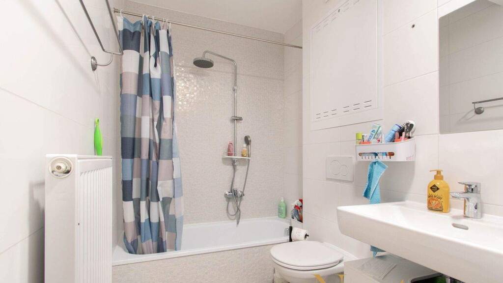 Die Toilette befindet sich ebenfalls im Badezimmer.