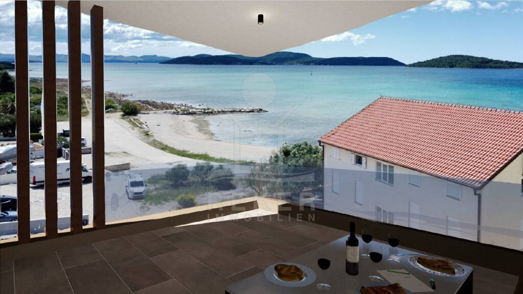 Das Gebäude hat acht Wohnungen, verteilt auf drei Etagen und ein Flachdach. Im Erdgeschoss gibt's Gärten, ab dem ersten Stock freie Sicht aufs Meer. Modernes Design, klare Linien, helle Fassade. Die oberen Wohnungen mit Balkon, ganz oben sogar mit großer Dachterrasse. Jeder Wohneinheit ist ein Parkplatz zugeordnet. Fertigstellung ist für Herbst 2026 geplant.