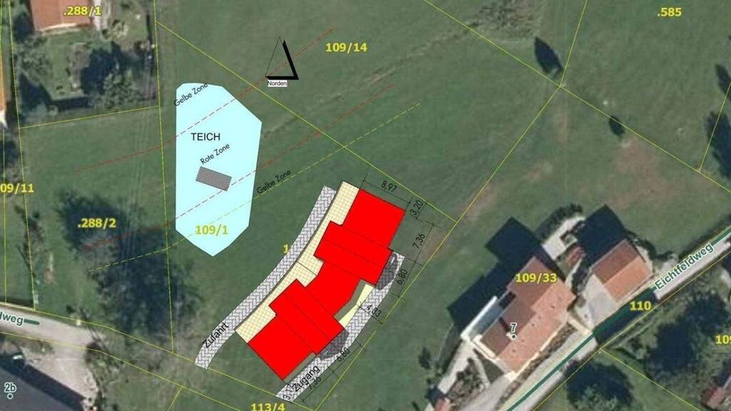 Weiters gibt es für dieses Grundstück bereits einen bewilligten Einreichplan für ein modernes Zweifamilienhaus. Diese Planung kann zu einem zusätzlichen Preis von 7.000,- EUR erworben werden. Sämtliche Gutachten, die für die Baubewilligung notwendig sind liegen vor.