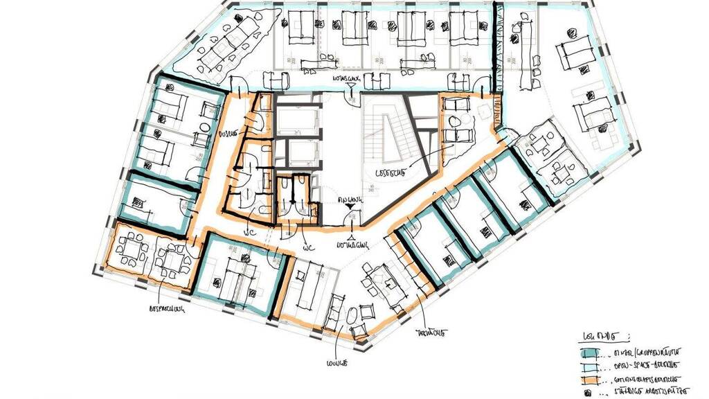 Die vollständig eingerichtete Büroeinheit für bis zu 10 Personen ermöglicht einen sofortigen Arbeitsbeginn. Ergänzend stehen hochwertige Gemeinschaftsbereiche wie Aufenthaltszone, Teeküche und ein modern ausgestatteter Besprechungsraum zur Verfügung. Die frequentierte Erdgeschosszone mit Gastronomie- und Fitnessangeboten bildet eine passende Ergänzung zu den Büroflächen in den oberen Geschossen. Die Öffnung der Altglan ermöglicht eine energieeffiziente Vollklimatisierung mit Bachwasserkühlung und Fernwärme.