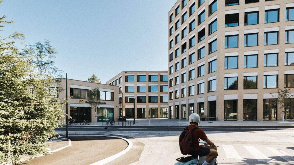 Das Gebäude Ensemble mit acht, zwei und vier Geschossen, nach Plänen von Dietrich | Untertrifaller Architekten, setzt an einer der zentralen Zufahrtsachsen Salzburgs einen markanten städtebaulichen Akzent. Die Lage bietet eine direkte Anbindung an die Autobahn A1, den Flughafen Salzburg sowie Bus- und Bahnverbindungen. Eine Tiefgarage mit rund 90 Stellplätzen ergänzt die gute Erreichbarkeit für Mieter und Besucher.