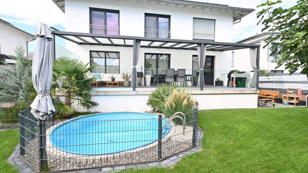 Ein weiteres Highlight ist der Außenbereich: Eine ca. 36 m² große, überdachte Terrasse mit Markise lädt zu entspannten Stunden im Freien ein. Der Garten mit Pool schenkt Urlaubsgefühle im Alltag.