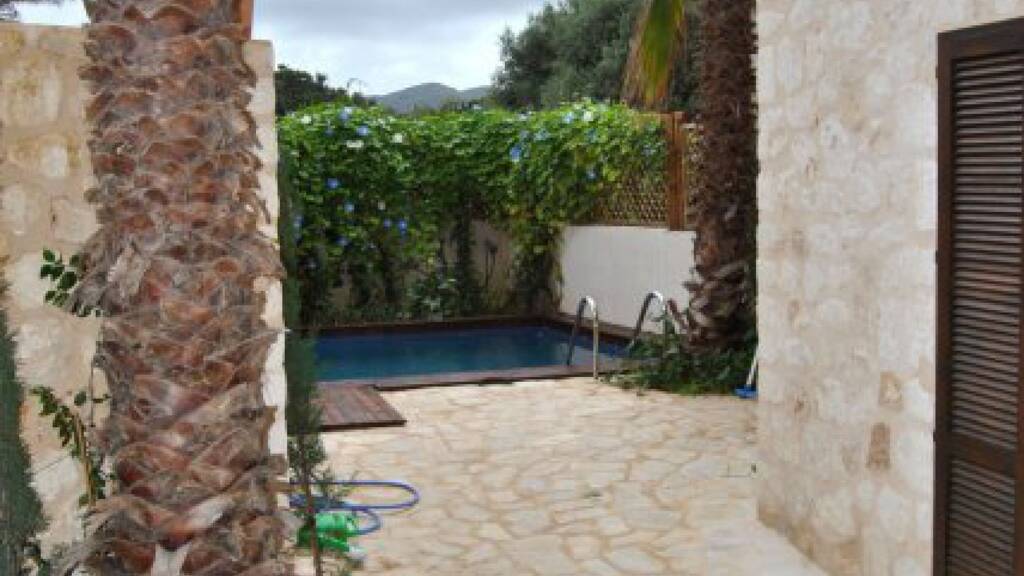 Erdgeschoss: Eingangshalle, Küche, Bad und Schlafzimmer mit Zugang zum Gartenbereich und zum Schwimmbad.
