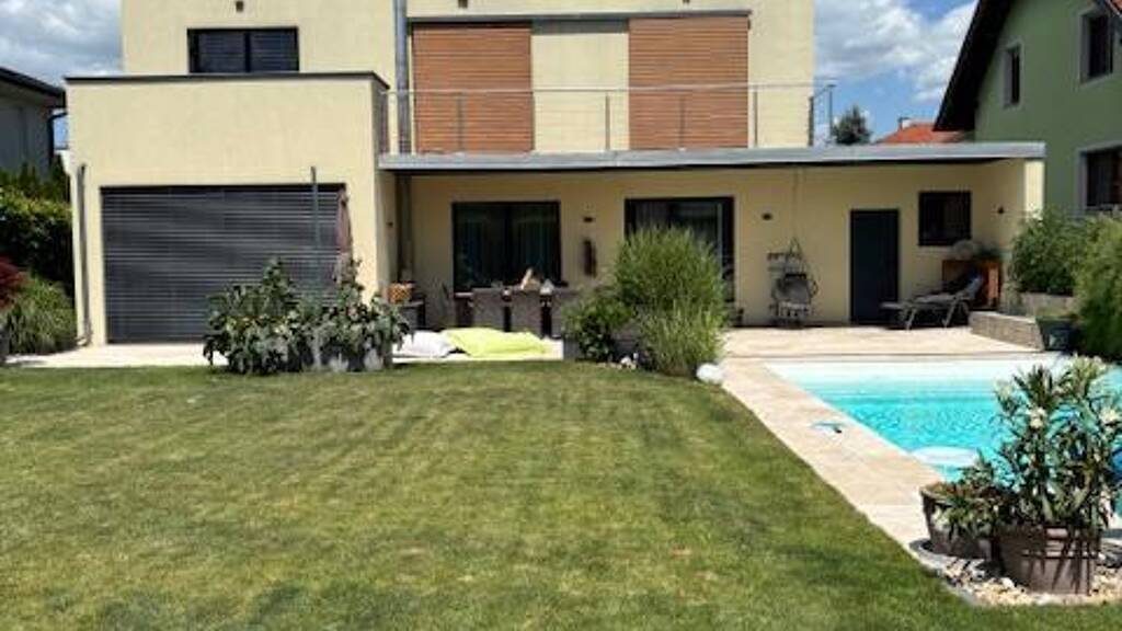 Erfüllt werden sämtliche Wohnwünsche inmitten einer modernen Wohnsiedlung durch einen wunderbaren Grünblick in den hauseigenen Garten, ein in Massivbauweise errichtetes Wohnhaus mit hohem Wohnkomfort, toller Belichtung, imposantem Wohnesssalon mit integrierter Faulmann Küche (SieMatic) samt hochwertigen Markengeräten, einen herrlichen Pool- und Terrassenbereich samt Sonnenschutz sowie einen gepflegten Garten, das alles unweit der Stadt Wien in ruhiger und sehr nachbarschaftlicher Wohnlage.