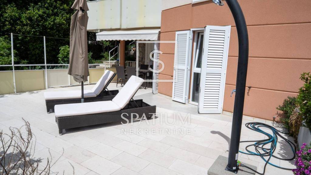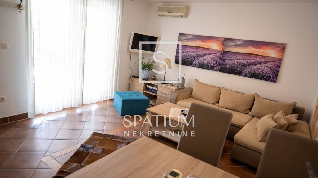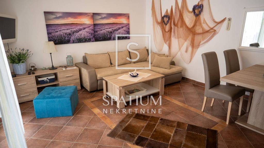 NOVI VINODOLSKI, wir bieten eine Wohnung in großartiger Lage, zweite Reihe vom Meer und Strand. Es befindet sich im Erdgeschoss eines kleinen und gepflegten Wohnhauses. Mit einer Fläche von 47,12 m² besteht es aus Flur, Küche mit Essbereich, Wohnzimmer, Schlafzimmer, Speisekammer, Badezimmer und Loggia. Zur Wohnung gehört ein PKW-Stellplatz. Möbliert und klimatisiert.