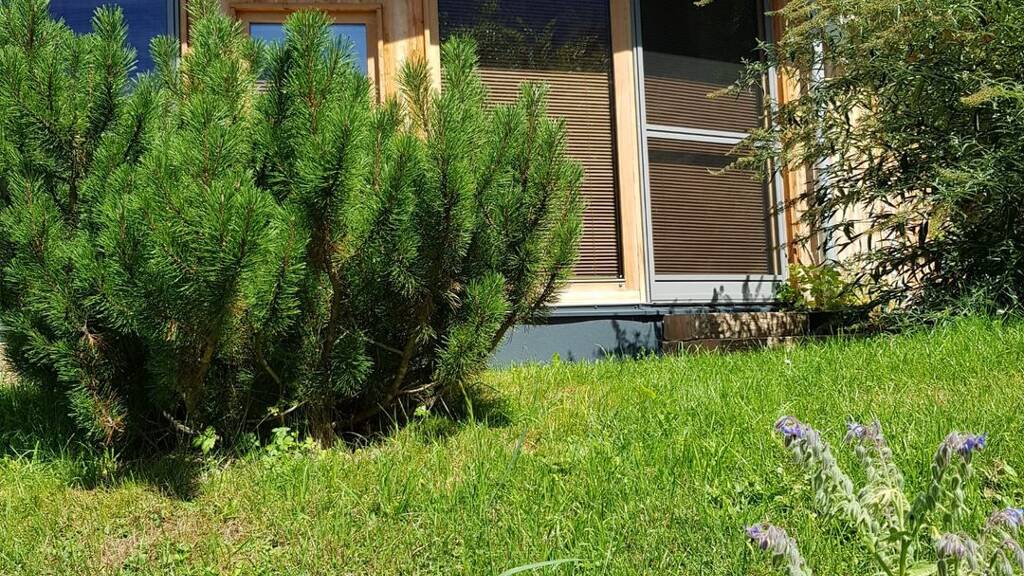 Der liebevoll und naturnah angelegte Garten wurde nach Prinzipien der Permakultur gestaltet mit Obstbäumen (z.B. Apfel), Sträuchern, Zedern, sowie ein kleiner feiner Naturteich mit Fischen, und eine eigene Wasserzisterne mit Brunnen. Dies alles vereint ökologisches Denken mit Ästhetik und Funktionalität.