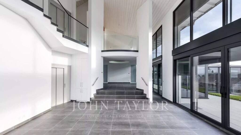 Im Erdgeschoss befinden sich ein geräumiges Wohn- und Esszimmer mit großen Fenstern und einer Deckenhöhe von sechs Metern, ein Büro, eine Veranda und ein prächtiger Wellnessbereich mit einem Jacuzzi und einem hellen Innenpool.
