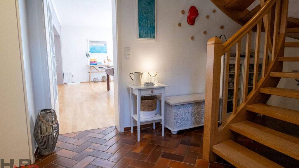 Im Obergeschoss, welches sich über eine attraktive Vollholztreppe erschließt, gehen alle Räume von dem zentralen Flur ab. Hier befinden sich 3 ungleich große Schlafzimmer und ein renoviertes Tageslicht Vollbad.