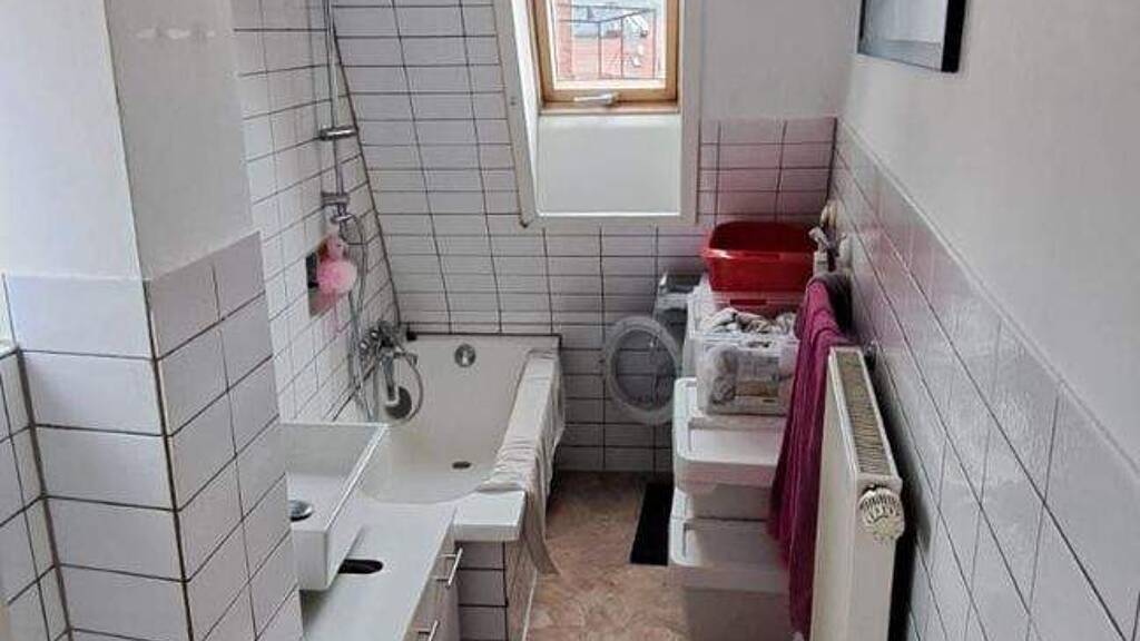 .Tageslichtbad mit Badewanne und WC .Waschmaschinenanschluss innerhalb der Wohnung .Laminatboden .Keller + Bühnenraum im Dachboden .Gasetagenheizung