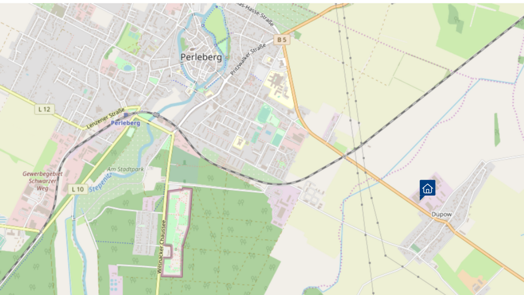 Düpow liegt im Nordwesten des Landes Brandenburg. Der Ort liegt ca. 2 km südöstlich von Perleberg mit ca. 12000 Einwohnern. Durch den Ort selbst führt die Bundesstraße 5 , welche direkt nach Berlin führt, was in ca. 150 km Entfernung liegt. Die nächste Autobahnauffahrt zur BAB 14 ist nur ca. 15 min zu erreichen. Die strategisch gute Lage zwischen Hamburg und Berlin verbunden mit einer bezahlbaren Kaltmiete war für alle bisherigen Nutzer ein erheblicher Standortvorteil.