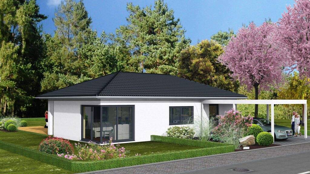 Es handelt sich bei diesem Hausbauvorschlag um einen modernen Bungalow mit ca. 117 m² Wohnfläche auf einem Areal von ca. 557 m². Genießen Sie die tolle Raumaufteilung sowie das komfortable, ebenerdige Wohnen auf diesem großzügigen nach Süden ausgerichteten Grundstück. Vom großen Wohn-/Essbereich mit wahlweise geschlossener oder offener Küche gelangen Sie über die großflächigen Terrassentüren in den nach Süden ausgerichteten Garten. Zudem verfügt der Neubau über ein Hauptschlafzimmer, einen zusätzlichen Raum, als Büro oder Gästezimmer nutzbar, ein geräumiges Badezimmer, ein Gäste-WC sowie einen praktischen Hauswirtschaftsraum.