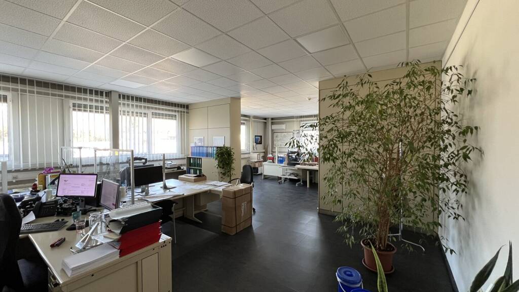 Der Gebäudekomplex umfasst mehrere Lagerhallen sowie einen großzügigen Bürotrakt mit Teeküche, Sanitäreinrichtungen und Besprechungsräumen. Die Hallen sind teilweise mit Hochregalen ausgestattet, auch ein kleiner Werkstattbereich ist vorhanden.