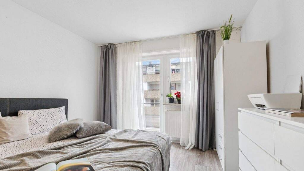 Auf der rechten Seite der Wohnung befindet sich das zweite Zimmer, welches als Schlafzimmer dient. Dieses überzeugt vor allem durch seine Größe, den quadratischen Schnitt sowie die große Fensterfront für maximale Helligkeit.