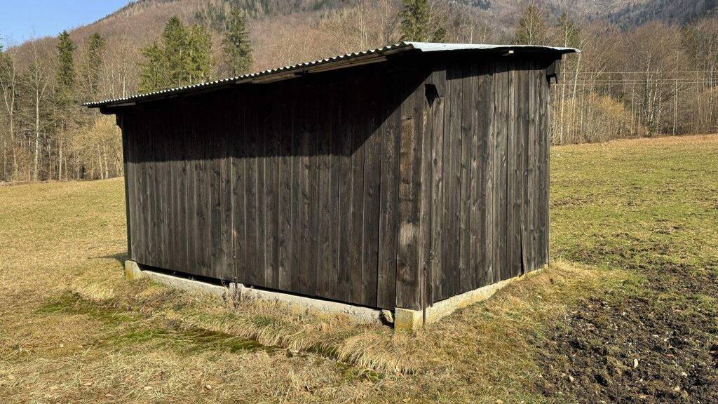Am Grundstück liegt eine Hütte / Einstellhütte. Im Kataster und im Grundbuch ist eine Baufläche ausgewiesen (Einstellhütte). Die Einstellhütte hat eine Außenbemaßung von in etwa 5 x 3 Metern, die Hütte erscheint technisch gut in Ordnung und liegt am Grundstücksrand nahe der öffentlichen Straße.