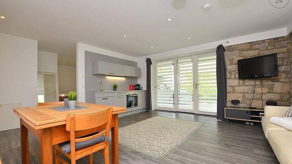Die ca. 50m² große Einliegerwohnung, welche mit Vinyl-Boden ausgelegt ist, befindet sich im Erdgeschoss eines Mehrfamilienhauses. Große, bodentiefe Fenster erlauben einen Blick auf die Weinberge und ins Grüne. Die Fenster sind mit Jalousien ausgestattet, um die notwendige Privatsphäre zu gewährleisten. Besonderen Flair bietet eine Natursteinwand im hellen Wohnraum. Dieser ist mit einer Couch, TV mit einer Bose-Soundanlage, Kommode, Essplatz für vier Personen und einer Einbauküche eingerichtet. Die Küche ist mit einem Herd mit Backofen, Kaffeemaschine und sämtlichen Küchenutensilien ausgestattet. Von hier gelangt man auf die sonnige Terrasse mit Blick in die Weinberge. Das Schlafzimmer ist mit einem 1,60m breiten Boxspringbett, Kleiderstange und einem offenen Hängeregal möbliert. Das hell geflieste Badezimmer verfügt über einer Dusche, Regal und einem WC. In dem vom Wohnzimmer aus zugänglichem, großzügigem Abstellraum ist eine Waschmaschinen-/Trocknernutzung vorhanden. Der Raum kann auch als zusätzliches Ankleidezimmer verwendet werden. In der angegebenen Miete ist eine Betriebskostenpauschale von 250€ enthalten. Bei einer Anmietung von 2 Personen erhöht sich der Mietpreis um 60€/Monat. Eine regelmäßige Reinigung kann gegen Aufpreis dazu gebucht werden. Bei Auszug wird eine Endreinigung je nach Aufwand mit der Kaution verrechnet. Parken ist auf dem Grundstück vor dem Eingang der Wohnung möglich. Die Alte Mainbrücke und die Innenstadt sind ca. 15 Gehminuten entfernt. Im Sommer wird die Wohnung nur an Wochenendheimfahrer vermietet.