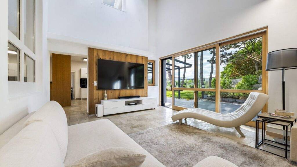 * Wir nehmen zwei Treppen und betreten das Wohnzimmer mit besonders hohem Luftraum, Platz für eine großzügige Sofalandschaft, viel Gemütlichkeit durch das hier auf einer Seite bis zum Boden gezogene Dach und den durch Holz wohlige Wärme erzeugenden Kamin. Hinzu kommt der Blick in den wunderschön gestalteten Garten mit hohem Entschleunigungspotenzial. Aber mehr dazu ein wenig später.